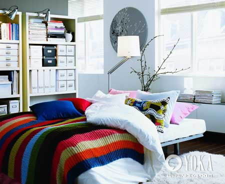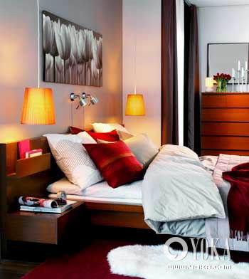 臥室整體色彩主要是看個人喜好,比較安全的做法是用淺色(白、米、灰、褐)作為基調(diào),同時按照個人愛好添加各種圖案和質(zhì)地的飾品(比如靠墊、窗簾、各種擺飾等)來增加情趣。淺色的優(yōu)點在于容易搭配配飾,可以根據(jù)季節(jié)來裝飾,也可以放心地加入其他色彩元素。而暖色系(紅、橙、黃)則能讓室內(nèi)充滿溫暖。同時,還要考慮到房間的朝向。朝南向陽的房間用冷色系較好;而朝北較暗的房間用暖色較好。