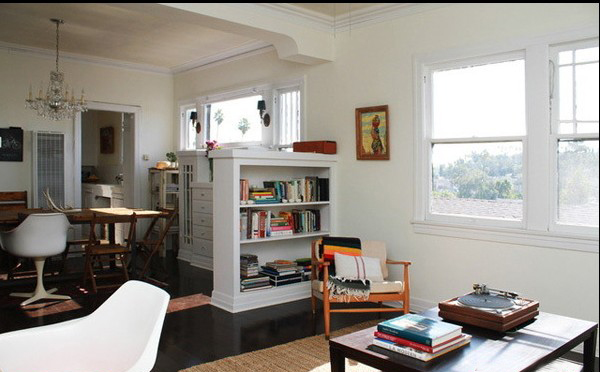概要:   這個明亮的公寓如同窗外的陽光一樣燦爛。以白色為主色調(diào),低調(diào)中彰顯迷人。并不昂貴的家具裝點(diǎn)出一個溫馨舒適的家?! ∨f舊的餐桌是業(yè)主MM自己淘回來的,是個二手貨哦。在這個白色的空間里卻成為一大亮點(diǎn)在  將客廳的一角做為工作室,沒有單獨(dú)隔起來,一是因為空間不夠,二來也不用,都是安靜的人,不會相互干擾到。