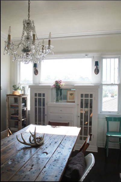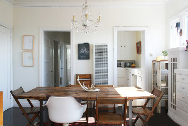 舊舊的餐桌是業(yè)主MM自己淘回來的,是個二手貨哦。在這個白色的空間里卻成為一大亮點(diǎn)在