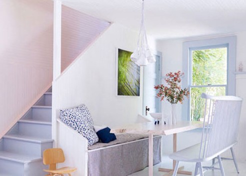 樓梯旁的空間作為早餐區(qū)域。正對大窗的位置可以感受到陽光傾瀉進(jìn)整個(gè)房間;純凈的白色墻面,在陽光下顯得清透明亮。