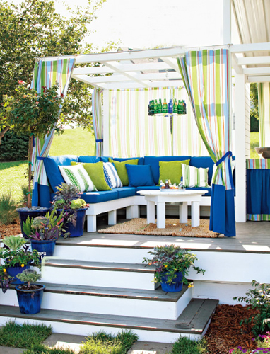 概要: 春天的色彩是豐富多彩的,最流行的莫過(guò)于白、藍(lán)、綠三種色彩,三色打造一個(gè)春意涼亭式露臺(tái)。它不僅會(huì)成為院子里的一道景觀,也讓你的戶外生活更豐富、更愜意!