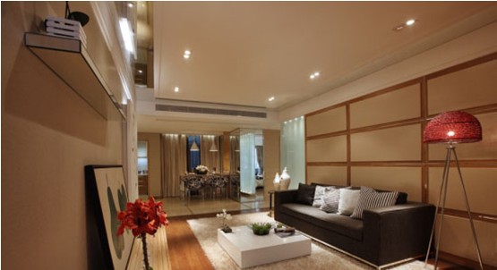 客廳簡(jiǎn)單的布局,簡(jiǎn)單的裝飾,卻在有效的燈光下熒熒生輝,紅色的裝飾花,紅色別致的落地?zé)?,依墻素雅的畫面等在白色調(diào)的燈光照耀下而有了情感語言,更有給人的感官印象,透射出其本身的內(nèi)涵氣質(zhì);