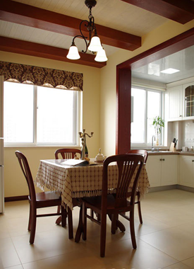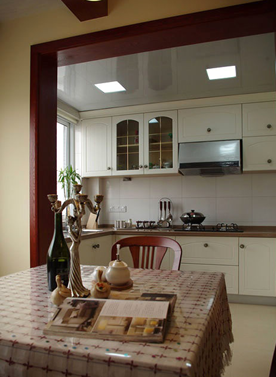 進門餐廳設計了一條邊的壁柜,放鞋,掛衣,放包兼顧。原結構有一道大梁,設計師順勢加做了三條水曲柳開放漆的假梁,配合白色木蠟油處理的杉木扣板,淡淡的美式鄉(xiāng)村風味。餐臺是最后購置到的家具,找了好多地方,主要是尺寸的限制,后來在家具市場淘到的,物美價廉。女主人配的桌布,很雅致。