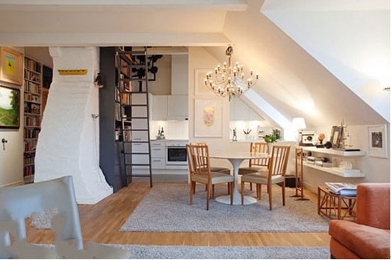 空間不大的小家里融合了LOFT元素的設(shè)計(jì),將廚房、餐廳和閱讀角打造于一體。通天的書架劃分出物質(zhì)和精神食量兩大區(qū),家具深淺色調(diào)的變化為白色空間帶來一絲新意。