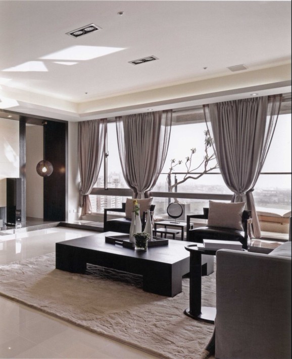 本案以簡約舒適為基底,同時加入美式古典風(fēng)。玄關(guān)采用大理石鋪地,設(shè)計師將原設(shè)計圖的黑白根大理石換成層次低調(diào)的木化石堆砌,并以削光手法處理以降低石材反光度,而玄關(guān)延伸而出的大理石則在低矮機柜起始,向客廳落地窗及書房延伸。設(shè)計師巧妙地以家具帶出空間的柔軟度,混搭性的裝飾古典線條從落地窗簾到沙發(fā),層層害顯空間品位。透過造型燈具的選用,不僅取代主燈光源,也讓空間更富味道。