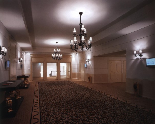 這是一個公共空間室內(nèi)走廊的設(shè)計,以地毯的鋪設(shè)作為軟裝飾元素,用暗色的細碎的花紋圖案來渲染出空間莊重、深沉的氣息,使人能夠從心底產(chǎn)生出一種嚴肅的情緒。