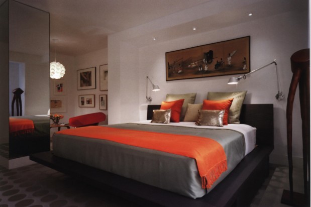 這是一個暖色的美式臥室,壁爐做為裝飾品出現(xiàn)在這里。色彩是室內(nèi)裝飾中永恒的主題,對于床的裝飾設(shè)計,色彩的應(yīng)用往往也能夠營造出意料之外的效果。在這個空間的設(shè)計中,紅色的床單、床頭以及壁紙的設(shè)計使空間變得熱情四射。