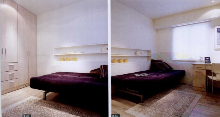書房、更衣室與小朋友房間都選用定制家具,既節(jié)省了施工時間 ,又省下木作費用,同時也滿足收納需求。墻面上的木架裝飾,成為小件裝飾品的置放地,為白色墻面減掉空白,為空間增加一些趣味。