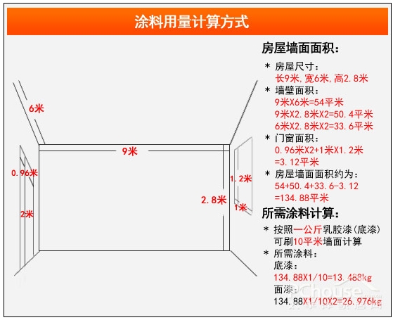 墻面刷漆的施工是一底兩面(一道底漆、兩道面漆)。墻面涂料的用量,一般根據(jù)一公斤的乳膠漆(或底漆)可刷10平米墻面來計(jì)算,折算后,即每平方米墻面需用1/10公斤的墻面漆。底漆用量=施工面積×1/10;面漆用量=施工面積×2×1/10。