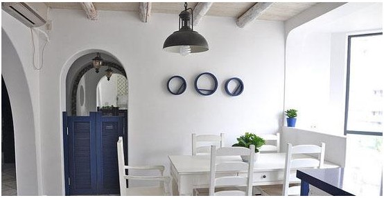 地中海首先映入眼簾的就是那片經(jīng)典的海藍(lán),為了在視覺(jué)上第一眼就渲染出濃郁的地中海風(fēng)情,客廳整體色調(diào)為藍(lán)白色,空間多選白色,再飾以明媚的天藍(lán),明朗又干凈,讓人仿佛徜徉在海洋之上。
