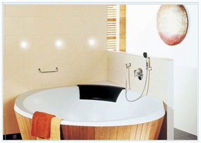 圓形浴缸的外表使用實(shí)木板條裝飾,給人自然親切的感覺。浴缸的邊沿有一個(gè)坡度,靠內(nèi)側(cè)的部分比較高,依靠起來更加舒適??客鈧?cè)的部分略低一些,進(jìn)出浴缸就更安全了。父母和孩子一起洗浴,輕輕地按摩能夠給孩子帶來更多的舒適感和安全感。