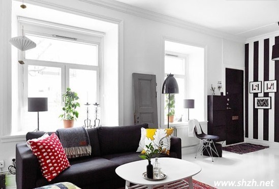從客廳的側面放眼望去,客廳的整體空間的主色調自然是以白色為底,黑色為輔,選用以黑色為主的家具和裝飾品的選擇搭配,再者簡單的紅白搭配的抱枕及地毯也成為客廳的亮色之一,并且活躍了空間的活力氛圍。使得整個客廳散發(fā)著時尚氣息,同時,這種混色搭配避免了模式化的冰冷房間,多了一份家的溫馨感。