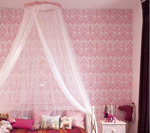 從吊頂下來的沙曼垂放在床上,粉粉的,床頭擺放著隨意的玩具造型。這是我兒時夢想的床啊。