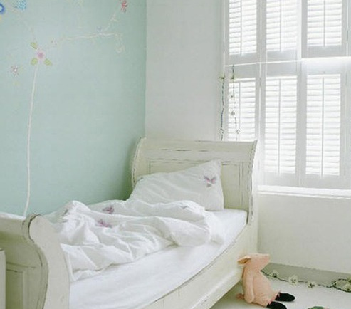 田園風的氣息也是小女生的愛,一張舒適的兒童床放在這白色透亮的屋子里,墻壁上用線條組成的壁畫形成花朵與地板上的藤蔓些相互映襯,散亂的書本和玩偶,沒疊的被子看得出這是一個不懂事的小女孩的房間。