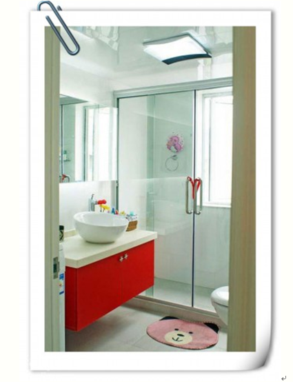 紅色永遠(yuǎn)是婚房的主題,喜慶的同時(shí)又不是浪漫,而越小的空間其實(shí)越容易營造這種氛圍。一個(gè)大紅色的浴室吊柜就能打破衛(wèi)生間冰冷的氣氛。淋浴房把手處綁上紅絲帶,也能為甜蜜加分。