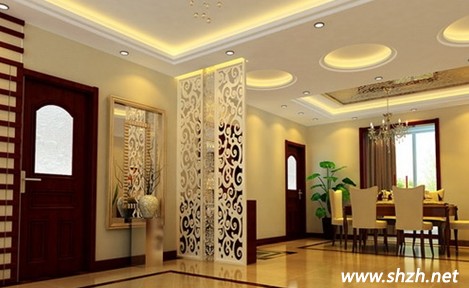 餐廳的壁畫墻是可以讓人駐足的地方,餐桌也要同樣的華貴典雅,吊頂可以采用浮雕圓形來實(shí)現(xiàn),會(huì)增添許多層次動(dòng)感。