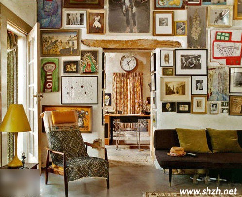 將家中的老照片或者自己喜愛(ài)的藝術(shù)化,隨意的貼在墻上,排成任何形狀都取決于你的興趣愛(ài)好,也能成為很好的裝飾墻。