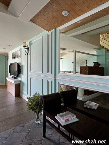 玄關(guān)處,古典的換鞋座椅是貼心的小細(xì)節(jié),家中的老人也可以從小小的細(xì)節(jié)中看見家人對于自己的關(guān)心而內(nèi)心溫暖,華麗的線條與其上面鏡框樣式的穿衣鏡想呼應(yīng),美式風(fēng)格躍然而出,原木色的地板看上次大氣穩(wěn)重。