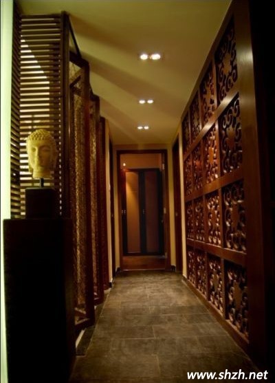 過道的裝飾物,花紋都是具有奇特色彩的南亞配飾,地板也有著同樣的效果。通過木質(zhì)材料來構(gòu)建或休閑或浪漫或異域風(fēng)情的感覺,在地板的操作上也較多采用實木地板。