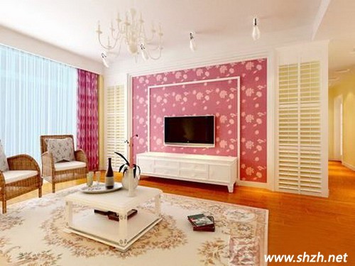 電視背景墻搭配TIPS:歐式田園風(fēng)格的裝修,白色主調(diào)搭配清新印花壁紙,打造秋日里的浪漫滿屋。