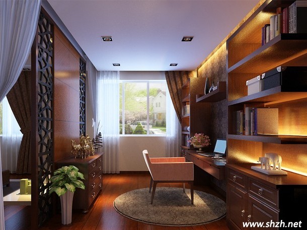 開放式書房在小戶型的空間里同時(shí)也具有很大的裝飾效果,但是干擾較大,因此會(huì)降低工作效率。所以我們就需要注意在用書櫥或用柜子、布幔等將空間隔開的同時(shí),還要保證書房的隔音效果。地面應(yīng)選用木地板或地毯等材料,來降低地面的傳感音效。而墻面的用材最好用壁紙、板材等吸音較好的材料,以取得書房寧靜的效果。如果用布幔來進(jìn)行隔斷,布幔的材質(zhì)最好選用既能遮光又具通透感的淺色紗簾比較合適。