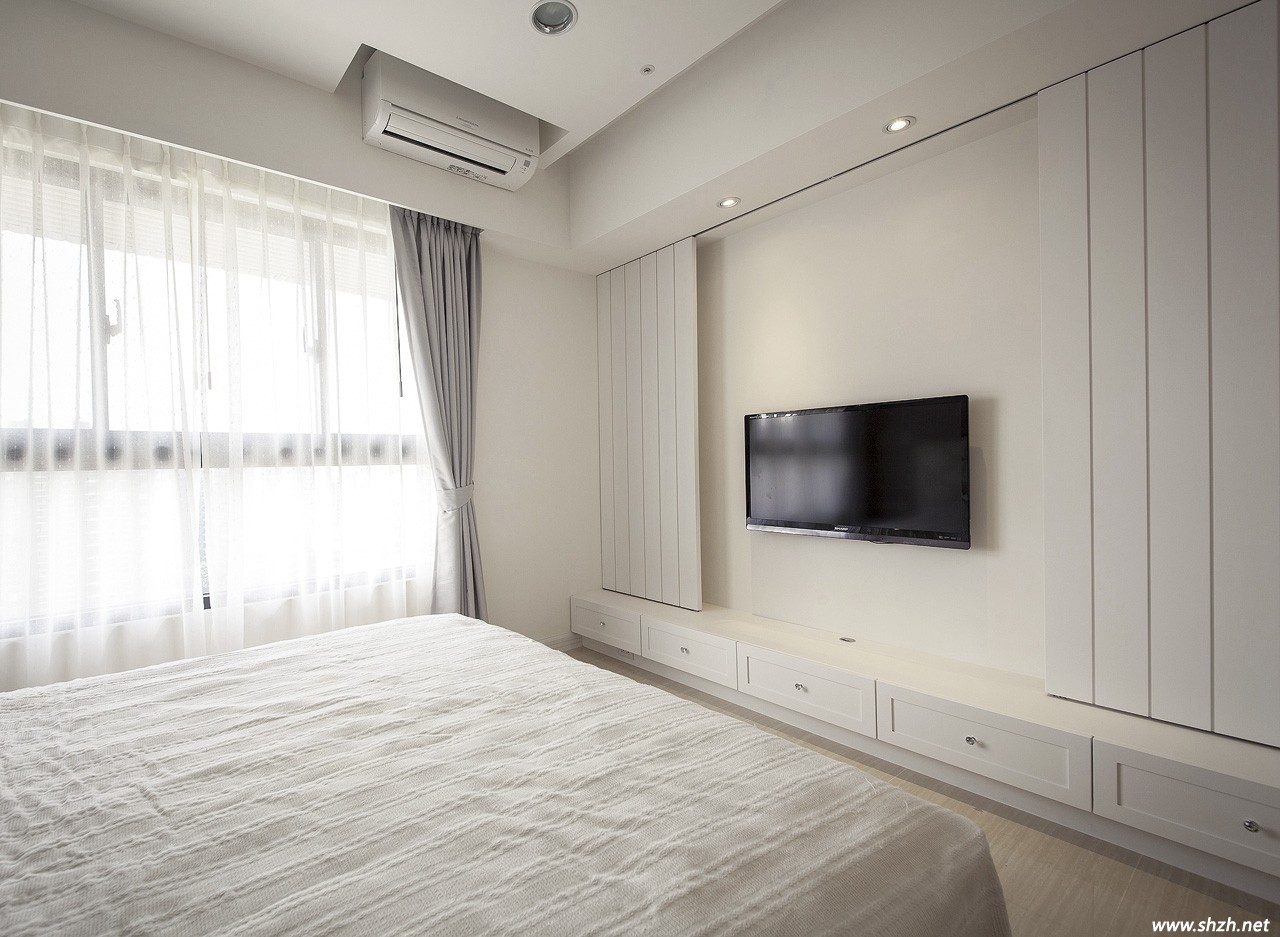 來到主臥室,這里交融著愛的結(jié)晶,充滿了男主人喜愛的簡約與女主人喜愛的美式古典,合并出“簡約古典”風(fēng)格。主臥室以白色為基底,低彩度的色調(diào)讓空間舒展開來,烘托出臥眠的溫度。較特殊的是電視墻與梳妝鏡的設(shè)計,為了維持純白平整的立面,設(shè)計者設(shè)置了兩道白色對應(yīng)式推門,巧妙的隱藏電視,避免電視屏幕反光,同樣會反射的梳妝鏡面也可以門片的方式作包覆,可靈活地開闔使用,讓臥眠空間沉穩(wěn)靜謐。