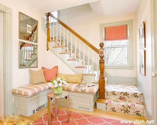 **色的玫瑰花鋪滿了整個(gè)樓梯,搭上家具的顏色搭配,打造一副田園甜美風(fēng)格。地毯上精美的花紋與室內(nèi)的色調(diào)相互融合,呈現(xiàn)明亮如春的居家氛圍。