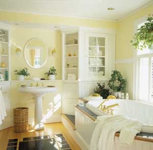 主浴室的櫥柜選擇相當(dāng)重要。如圖所示L形的組柜最大限度的利用了主浴室里的角落空間。同時(shí),整個(gè)浴室空間更顯氣派、敞亮。L形組柜的右側(cè)部分還提供了非常好的展示空間。