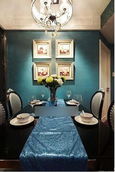 餐廳的吊燈是水晶的,這是不能錯(cuò)過的,整面墻是帶點(diǎn)藍(lán)色的。