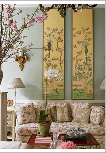 對(duì)稱的花鳥工筆畫卷,端麗雅致,在吊燈、壁燈、沙發(fā)等組合而成的標(biāo)準(zhǔn)西式客廳之中,依然能做到風(fēng)格上的渾然一體。