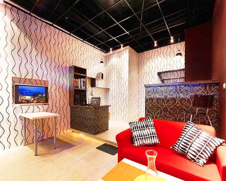 方案一:波普藝術(shù)風(fēng)格以亮白及暗紅兩色壁紙將空間一分為二,暗紅色規(guī)則波紋線條壁紙從沙發(fā)區(qū)一路延伸至后方吧臺區(qū)塊,亮白色不規(guī)則波紋線條壁紙則占滿了大片室內(nèi)空間;在休閑區(qū)選用安定感色系波紋,在工作區(qū)選用活潑明亮風(fēng)格壁紙,具象的沖突感在設(shè)計師巧手下呈現(xiàn)微妙平衡,再搭以藤蔓編飾圖紋深色壁紙包覆的吧臺及工作臺,擺上大紅及亮白的造型沙發(fā),營造lounge bar氛圍,成為寓工作于娛樂的工作空間。