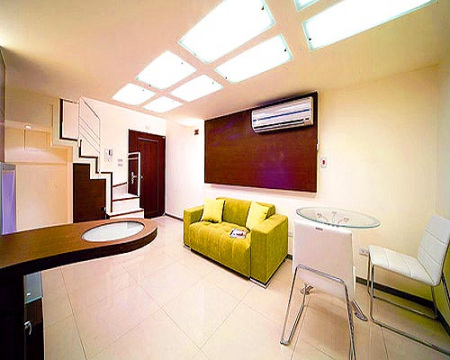 方案二:現(xiàn)代機能 實用至上 沙發(fā)背后的鐵刀木簡約背墻,既包覆住冷氣管線,在近門處一側(cè)并裝有感應(yīng)式照明,用溫暖光線歡迎返家的居住者,另外三側(cè)亦設(shè)置間接光源,讓空間光影表情更生動。本案設(shè)定為投資用途,天花板的幾何方塊設(shè)計,遮掩丑陋的日光燈管,維修方便,且分段式開關(guān)發(fā)揮節(jié)源功能,明亮的光源,做為住屋或是小型工作室出租皆無問題。