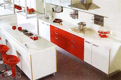 “更加合理地利用空間,營造出一種‘喜歡做飯’的感覺”對于廚房主人來說最合理的布局,也往往最能體現(xiàn)其個性,滿足其時尚需求。首先要考慮烹飪作業(yè)的方面:取用廚具要簡單方便,物品收納要有條理,還要有專業(yè)的動線規(guī)劃。依據(jù)不同的地形條件可以選擇一字型,L型,U型或島型的整體布局。而主人的習(xí)慣和品位也極大地影響最終成形的設(shè)計。