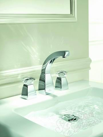 延續(xù)新巴洛克的潮流,借助純正鉑金的涂層裝飾方法,將鉑金的植物花紋環(huán)繞在面盆上下,用貴重的金屬色,結(jié)合華麗的裝飾品,使浴室環(huán)境設(shè)計(jì)提升至一個(gè)全新的檔次。這款龍頭,配有施華洛世奇水晶制成的把手,并分為清如水晶的自然色以及藍(lán)寶石般的中性藍(lán)色,簡(jiǎn)直像精美的首飾一般。
