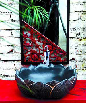 荷花容易讓人想到意境悠遠(yuǎn)的環(huán)境,荷花造型的手盆更容易讓人產(chǎn)生無盡遐想。黑色給手盆增添了厚重,光滑的內(nèi)部讓人感覺到石藝的溫潤(rùn),這樣的手盆搭配紅色古典浴室柜給人幽香的感覺。