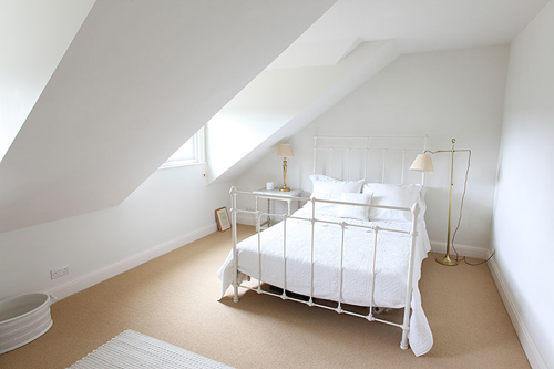 二樓的臥室非常簡(jiǎn)潔,英式的床是主要的家具。頂面是斜坡狀的,像小閣樓一樣。