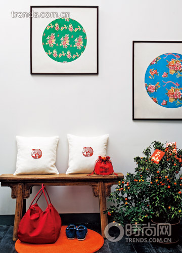 玄關(guān),是一個(gè)家最先要展現(xiàn)給大家的地方。如何在春節(jié)里把自家的玄關(guān)打造得與眾不同呢?讓我們來(lái)看這個(gè)玄關(guān):用美麗的民間花紙裝裱成的裝飾畫(huà),開(kāi)門(mén)見(jiàn)山地烘托出了節(jié)日的氣氛,中國(guó)風(fēng)味撲面而來(lái)。一條古舊的小條凳,兩個(gè)溫暖的靠包,營(yíng)造出家的溫馨氣息,又有實(shí)用效果。橙色的圓地毯,色彩艷麗,造型可愛(ài),可以隨意地放置包袋。