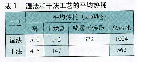 為了對這兩種生產(chǎn)工藝的生產(chǎn)成本作一個簡單的比較,表1對比了兩種工藝的熱耗。從表中可以看出,“巴西干法”工藝的平均熱耗明顯較低.而且區(qū)別最顯著的是窯的熱耗,說明“巴西干法”工藝之所以經(jīng)濟(jì),并不僅僅因?yàn)閲婌F干燥器的能耗問題。