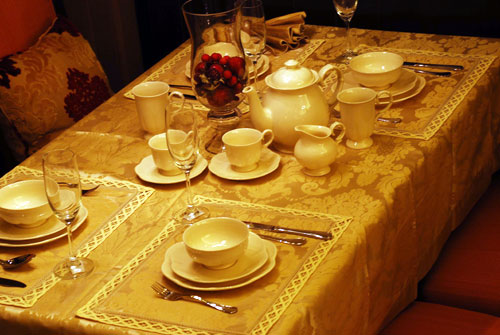 餐桌上,餐布選用暗金色帶緹花的設計展現(xiàn)低調(diào)的奢華感,配合素雅的奶白色餐具別有一番特色,再擺上一個玻璃的器具做點綴,內(nèi)置紅色的裝飾品也跟其粉紅色的椅子相呼應,更顯優(yōu)雅溫馨的感覺。