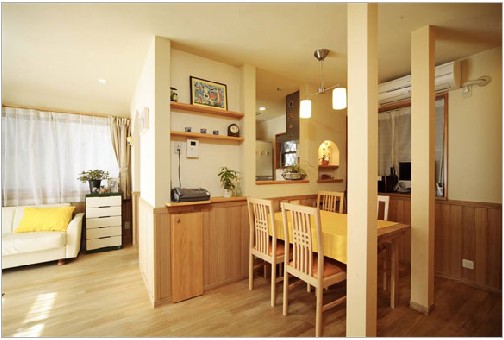 餐廳背景墻面設(shè)計(jì)成小書架,閑暇時(shí)可以翻閱菜譜。廚房設(shè)計(jì)則是半開放式的,坐在飯廳這里可以看到廚房內(nèi)部,暖黃色的實(shí)木餐桌給人很溫暖的感覺。