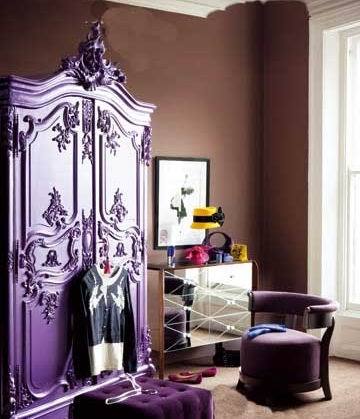 如果你是視覺沖擊力很強的色系的忠實擁護者,那么千萬不要錯過這個最奪目的房間造型。散發(fā)著珍珠光澤的紫色古典樣式衣柜,觸感舒適的絲絨沙發(fā)凳,搭配用鏡面裝飾的梳妝臺,制造出位的華麗效果。