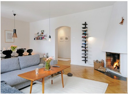 白色的墻面上黑色的簡約層架,即是裝飾品又是儲物空間。熊熊燃燒的篝火也許不太適合中國的家庭,但仿壁爐式的取暖爐配合一下煙囪的造型,在寒冷的天帶來暖風(fēng)的同時,不同用出國就能感受北歐般的生活。