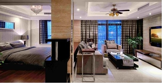 臥室也被做成了敞開式的,一開始業(yè)主很擔(dān)心,應(yīng)為決定很沒安全感,但是為了拉伸空間感,也算小犧牲了一把。本來業(yè)主心里還有點(diǎn)怨氣,但最后的整體效果也讓他消了氣。整體色調(diào)相貫通,而且還省了戈電視機(jī),何樂而不為。哈哈。