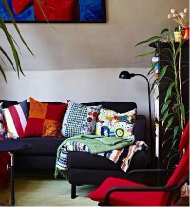 客廳布置設計的豐盈而立體,糖果色的靠枕,彩色拼接地毯,出眾的色彩搭配立刻讓灰色的沙發(fā)外觀變得豐滿起來,使得客廳盡顯歡快本色。