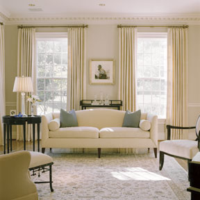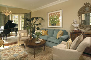 在這間充滿陽光的客廳里,設(shè)計(jì)師布置了原型沙發(fā)與芭芭拉巴里桃花心木做成的桌子以及沙發(fā)旁邊的橢 圓形小桌子。溫柔有色墻壁,是由科羅拉多藝術(shù)家威廉馬修斯用水彩設(shè)計(jì)的??蛷d鋪的地毯使整個(gè)房間內(nèi)形成一個(gè)圓形的交談區(qū) 。