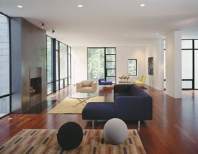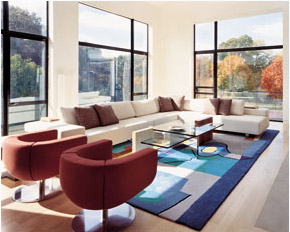 室內(nèi)設(shè)計(jì)師理查德geary讓座位成為這個(gè)客廳的主宰,不論是沙發(fā)還是椅子。他曾設(shè)計(jì)過風(fēng)俗地毯和雞尾 酒桌。紅色意大利椅子作了一個(gè)大膽的嘗試。