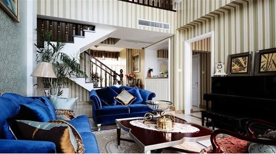 推門而入時,那一股貴族藍的氣息就向你迎面襲來,色彩豐富的抱枕裝飾則巧妙地過渡了空間的色澤順序。各式精美的工藝品令人耳目一新,美式古典造型的家具陳列,在提供業(yè)主功能便利性的同時,也賦予空間一種別致的美感。