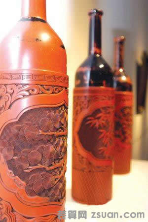 這組酒瓶套是以純天然的大漆和麻布為原料,采用最高貴的雕漆手法,將現代酒瓶造型與古典松柏圖案相結合,同時具有懷舊的斑駁感,這是目前漆藝家居設計的一大流行趨勢。