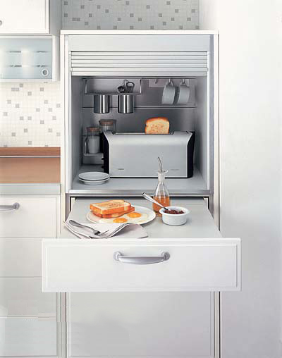 既可作為簡(jiǎn)潔的早餐臺(tái),又可以作為烹飪操作的料理臺(tái),用折疊式軌道將餐臺(tái)收藏在柜體里,就是一個(gè)抽屜的外觀,很節(jié)省空間。