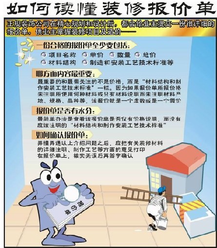 這是因?yàn)椋彝パb修也應(yīng)有一個(gè)造價(jià)預(yù)算的程序:材料費(fèi)、施工費(fèi)、管理費(fèi)、利潤(rùn)等都應(yīng)該明確。而沒(méi)有信譽(yù)、質(zhì)量和服務(wù)保證的裝修公司或施工隊(duì)往往采取一口報(bào)價(jià)或低于別人報(bào)價(jià)的做法承攬業(yè)務(wù)。